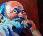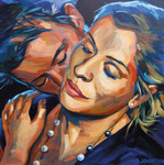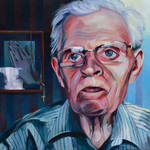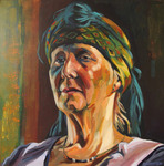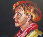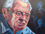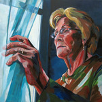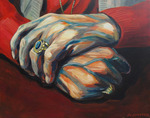 2014Met 3 portretten volgde ik een dementerende persoon. De vorige schilderijen 'hersenschimmen', (genoemd naar het boek van Bernlef), zijn voorgangers van dit schilderij. Het eerste portret liet een 'verdwaald zijn' zien. Het tweede was de 'verlorenheid'. Het laatste heet 'De Rozenkrans'. Het is een soort afscheid van de werkelijkheid en een 'overgave' aan de innerlijke wereld van deze religieuze mens.