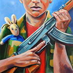 2015Ik heb gekozen voor een kind-soldaat (war-child): een kind dat gedwongen wordt zijn kind-zijn aan de kant te zetten om te dienen als soldaat in een oorlog. Een kleurrijke afbeelding, misschien zelfs vrolijk te noemen. Een vrolijke veilige wereld, wat de wereld van een kind zou moeten zijn. Het knuffelkonijn staat symbool voor het kind-zijn. Het wapen zet letterlijk een grove streep, diagonaal door deze wereld. Neemt hem zijn onschuldige kinderwereld af. De ogen van het kind zijn niet zichtbaar. Zo wordt het onherkenbaar, anoniem. Het zou ieder kind kunnen zijn.