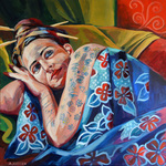2017Kleurrijke dame. Letterlijk en figuurlijk. Geschilderd in kimono met focus op markante tattoes.